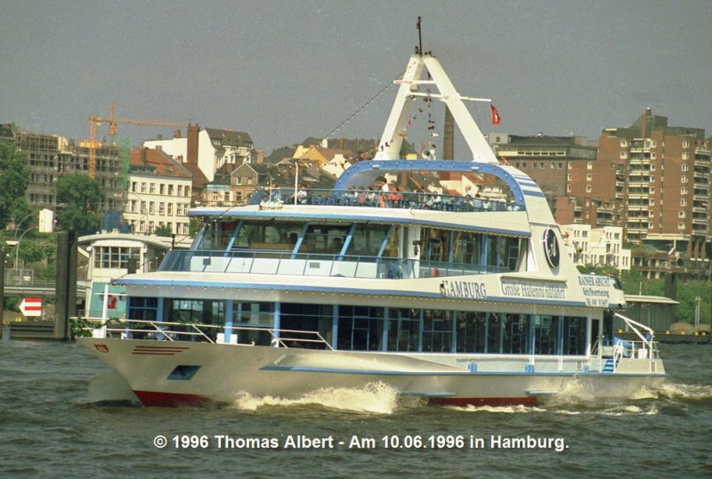 Name:  HAMBURG  / Baujahr: 1995-1996 / Bauwerft: Schiffswerft Tangermünde in Tangermünde (Deutschland) im Verbund der Deutschen Binnenwerften GmbH / Flagge: Deutschland / Länge: 55,50 m / Breite: 11,39 m / Tiefgang: 1,58 m / 500 Passagiere / Antrieb: 2 x 314 kW auf zwei Schottel-Ruder-Propeller (SRP 170) / Eigner ~ Betreiber: Rainer Abicht Elbreederei GmbH in Hamburg / Heimathafen: Hamburg / Fahrtgebiet: Elbe (Hamburger Hafen) / Schiffs- oder Registriernummer: ? / Bemerkung: Die offizielle Schiffstaufe erfolgte am 06.06.1996 durch den Oberbürgermeister der Hansestadt Hamburg, Herr Dr. Henning Voscherau.