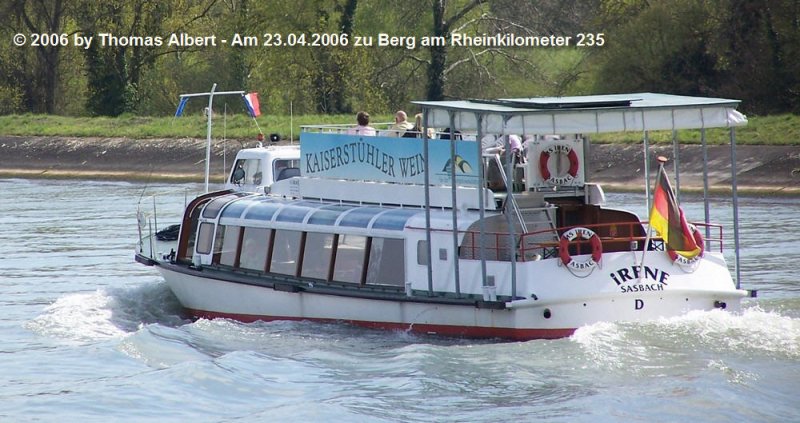 Name: "LYRA" , ex "IRENE" - 2007 , ex "HOCHRHEINPIONIER KUNZ" - 1997 , ex "MONTROAL" - 1979 / Baujahr: 1963 / Bauwerft: ? in ?(Niederlande) / Flagge: Deutschland / Länge: 18,60 m / Breite: 4,20 m / Tiefgang: 1,20 m / 100 Passagiere / Antrieb: 2 x 100 PS / Eigner ~ Betreiber: Wolfgang Bonfert in Osnabrück , ex Personenschiffahrt Manfred Kunze in Sasbach (1998 bis 2007) , ex ? / Heimathafen: Osnabrück , ex Sasbach bis 2007 , ex unbekannter Ort am Hochrhein bis 1997 , ex unbekannter Ort an der Mosel bis 1979 , ex Karlsruhe bis 1970 / Fahrtgebiet: Stichkanal nach Osnabrück und Mittellandkanal , ex Rhein und Canal de Colmar bis 2006 , ex Mosel bis 1979 , ex Rhein bis 1970 / Schiffs- oder Registriernummer: ? / Bemerkung: Von der Bauart entspricht es den Grachtenbooten wie sie in Amsterdam eingesetzt werden. Zumindest bis auf das höher gesetzte Steuerhaus und das nachträglich aufgebaute Oberdeck.
